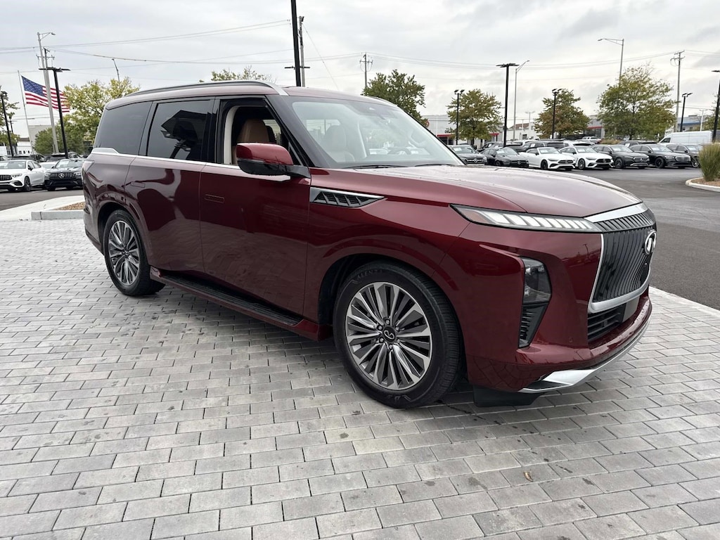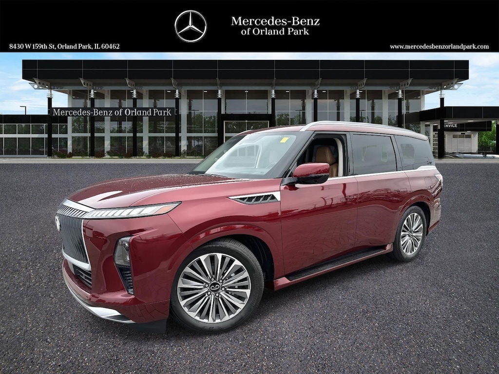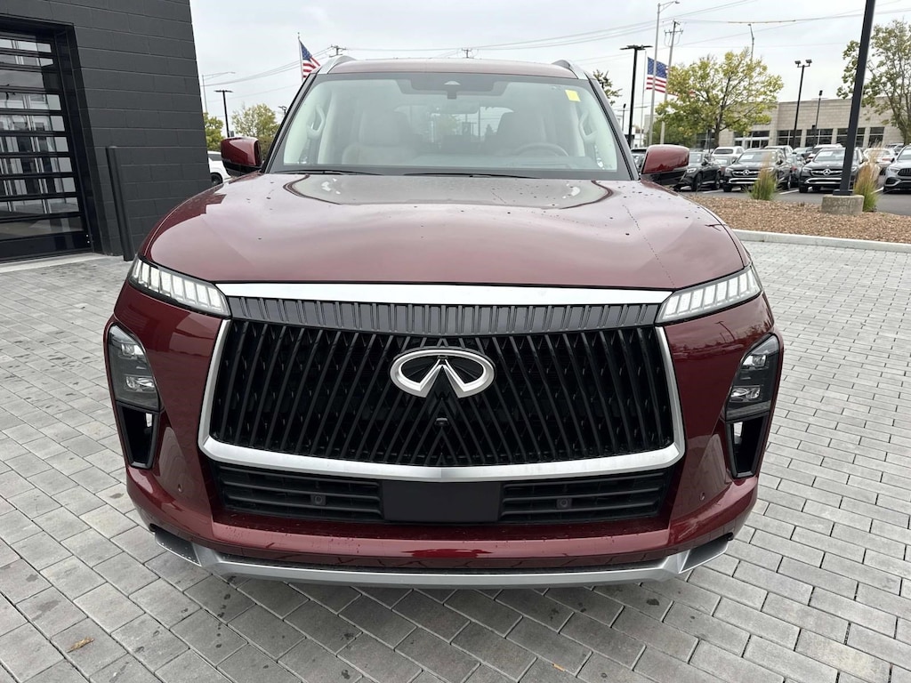 Coulis Red 2025 INFINITI QX80 LUXE 4WD 9-Speed Automatic 3.5L V6 DOHC 24V 14 Speakers, AM/FM radio: SiriusXM with 360L, Apple CarPlay/Android Auto, Audio memory, Auto tilt-away steering wheel, Auto-dimming Rear-View mirror, Heads-Up Display, Heated door mirrors, Memory seat, Navigation system: Google Built-in, Power door mirrors, Power driver seat, Power moonroof, Power passenger seat, Power steering, Premium Paint, Radio data system, Radio: Klipsch Premium Audio System w/14 Speakers, Rear reading lights, Rear seat center armrest, Reclining 3rd row seat, Split folding rear seat, Tachometer, Telescoping steering wheel, Tilt steering wheel, Turn signal indicator mirrors, Ventilated front seats.